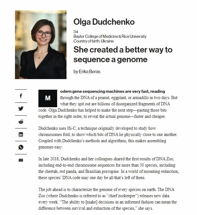 «Комп'ютери, які зчитують послідовність генів, читають ДНК арахісу, баклажана чи броненосця дуже швидко. Але вони видають лише мільярди неорганізованих фрагментів коду. Ольга Дудченко зробила наступний крок - зібрала ці шматки інформації докупи, щоб виявити, власне, геном - швидше та дешевше », - розповіли в Массачусетському інституті.