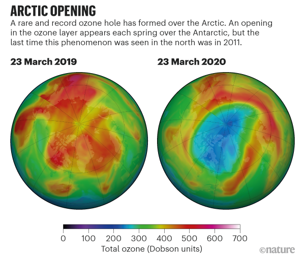 У цьому році над Арктикою було більше холодного повітря, ніж в будь-яку зиму. При низьких температурах утворилися високогірні хмари і почалися хімічні реакції руйнування озону. Вчені запевнили, що арктична озонова діра не становить загрози для здоров'я, тому що Сонце тільки починає підійматися над горизонтом у високих широтах.