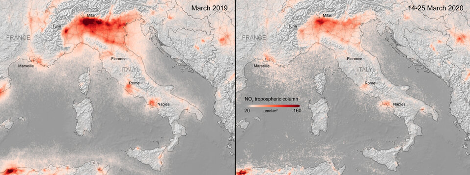 Супутникові знімки показують, як падає рівень забруднення в країнах Європи після того, коли уряди ввели обмежувальні заходи через коронавірус. У Європі нині спостерігається те ж, що раніше в Китаї, коли великі міста були змушені відмовитися від транспорту у зв’язку з карантином.