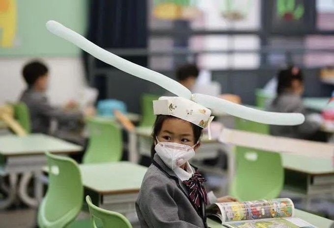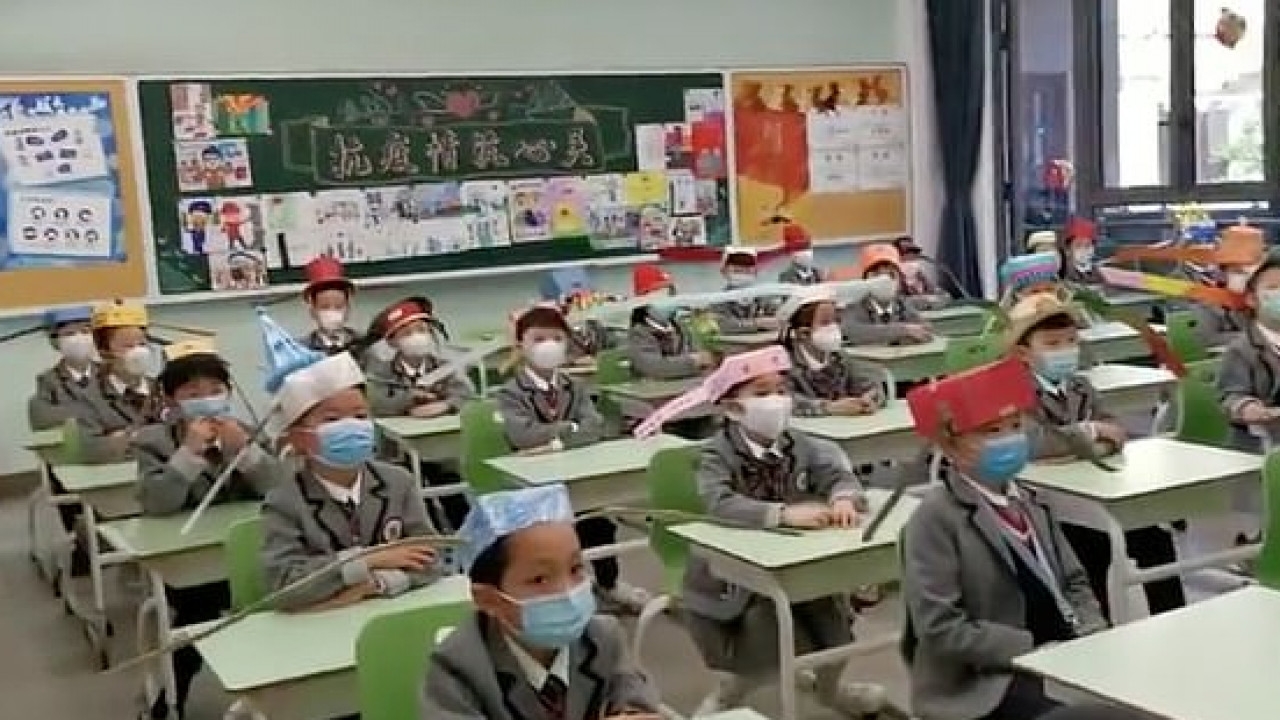 У Китаї діти повернулися до шкіл і носять противірусні капелюхи